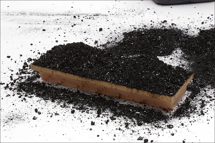 Eerst wordt een gelijkmatige laag over het gehele MDF-oppervlak aangebracht, waarna hoopjes worden gemaakt. Het blokje plaats ik op een vel papier, zodat overtollige kolen eenvoudig kunnen worden verwijderd en hergebruikt.